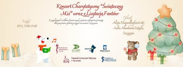 IFMSA-Poland oddział Szczecin wraz z Parlamentem Studentów Pomorskiego Uniwersytetu Medycznego w Szczecinie po raz kolejny organizują Koncert Charytatywny wraz z licytacją fantów. Zebrane środki zostaną przeznaczone na zakup prezentów dla dzieci, które podczas Świąt Bożego Narodzenia zmuszone będą pozostać w szczecińskich oddziałach szpitalnych i nie spędzą tego magicznego czasu z rodzinami w domu.
