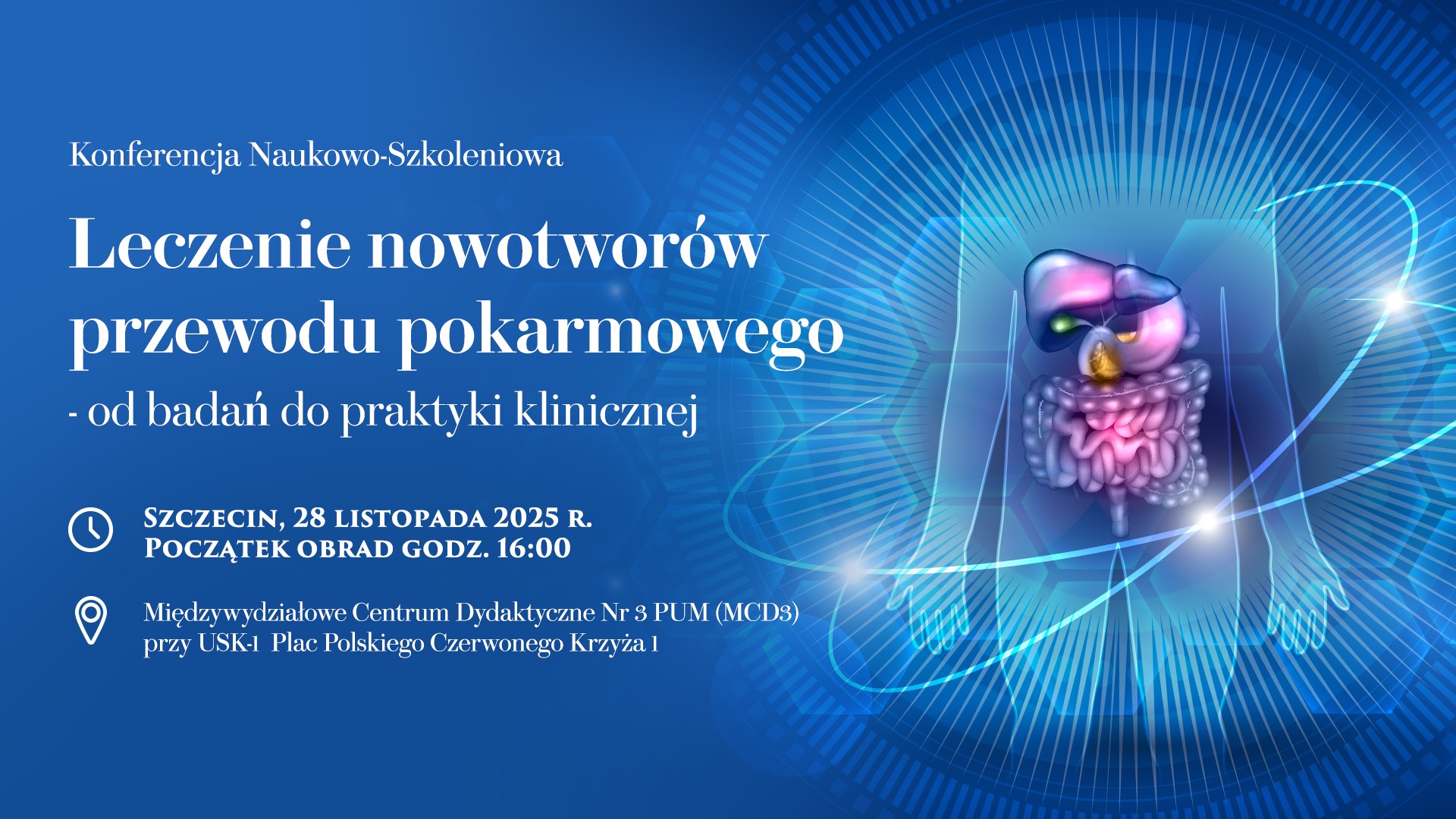 mam zaszczyt zaprosić Państwa do udziału w Konferencji Naukowo-Szkoleniowej „Leczenie nowotworów przewodu pokarmowego – od badań do praktyki klinicznej”, która odbędzie się 28 listopada 2025 r. w Międzywydziałowym Centrum Dydaktycznym Nr 3 PUM (MCD3) przy USK -1 Plac Polskiego Czerwonego Krzyża 1 w Szczecinie.