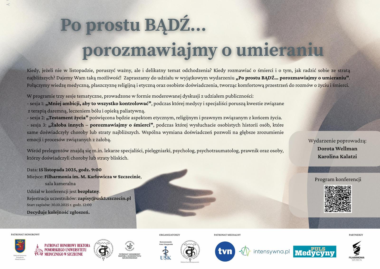 Śmierć, odchodzenie i żałoba to tematy, o których często trudno rozmawiać. Jak jednak mówić o nich z bliskimi? Jak wspierać osoby w żałobie i jak samemu radzić sobie ze stratą? Odpowiedzi na te pytania poszukają uczestnicy konferencji „Po prostu BĄDŹ… porozmawiajmy o umieraniu”, która odbędzie się 15 listopada 2025 roku o godz. 9:00 w Filharmonii im. M. Karłowicza w Szczecinie (sala kameralna).
