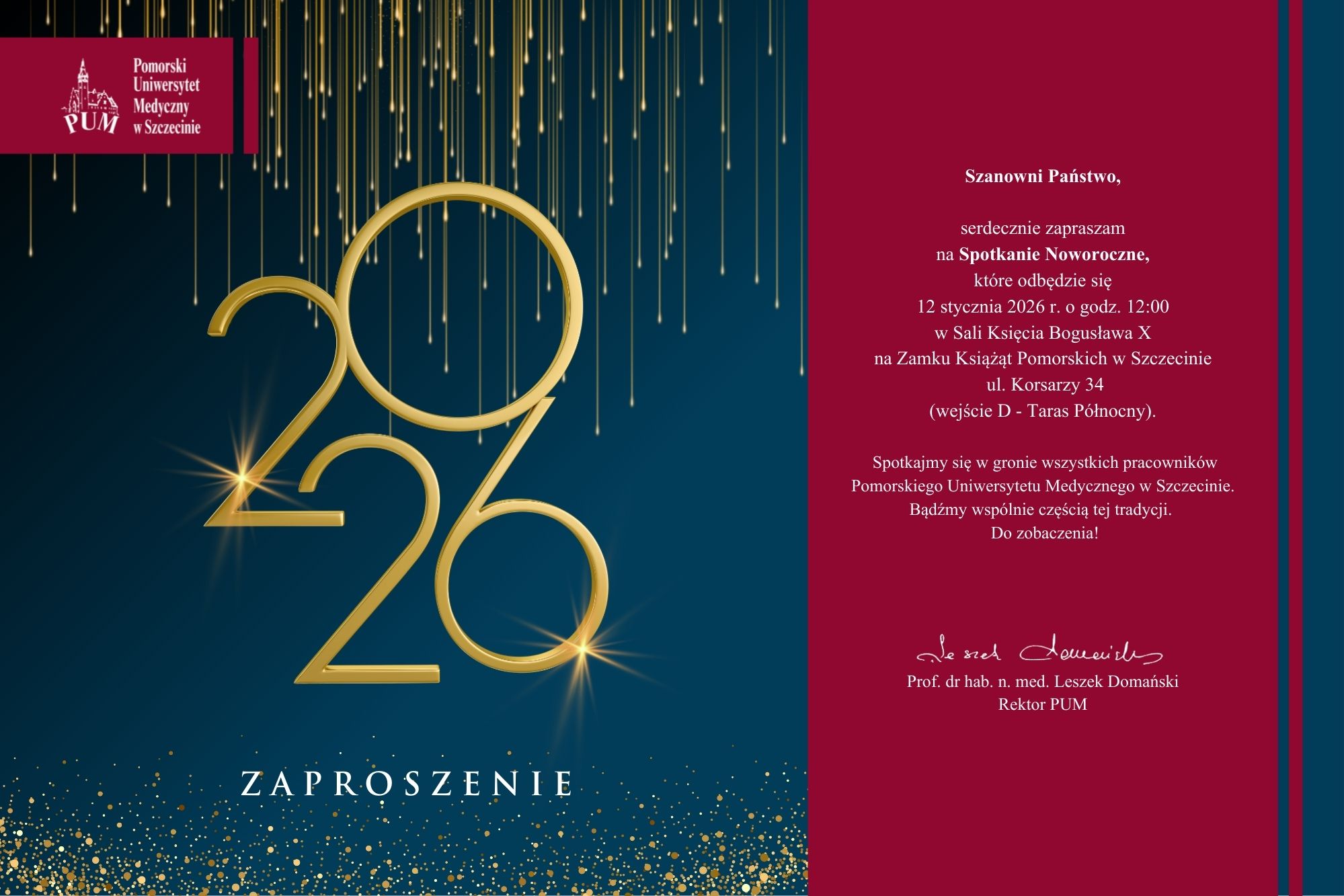 Rektor Pomorskiego Uniwersytetu Medycznego w Szczecinie, prof. dr hab. n. med. Leszek Domański, serdecznie zaprasza wszystkich pracowników Uczelni na Spotkanie Noworoczne, które odbędzie się 12 stycznia 2026 r. o godz. 12:00 w Sali Księcia Bogusława X na Zamku Książąt Pomorskich w Szczecinie.