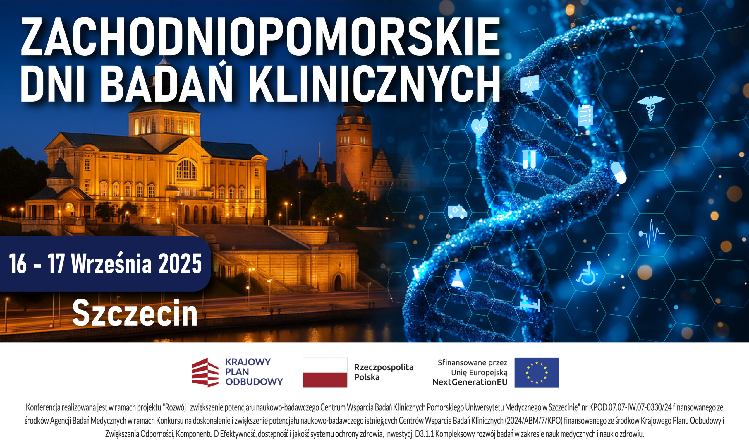 Konferencja realizowana jest w ramach projektu „Rozwój i zwiększenie potencjału naukowo-badawczego Centrum Wsparcia Badań Klinicznych Pomorskiego Uniwersytetu Medycznego w Szczecinie” nr KPOD.07.07-IW.07-0330/24 jest finansowany ze środków Agencji Badań Medycznych w ramach Konkursu na doskonalenie i zwiększenie potencjału naukowo-badawczego istniejących Centrów Wsparcia Badań Klinicznych (2024/ABM/7/KPO) finansowanego ze środków Krajowego Planu Odbudowy i Zwiększania Odporności, Komponentu D Efektywność, dostępność i jakość systemu ochrony zdrowia, Inwestycji D3.1.1 Kompleksowy rozwój badań w zakresie nauk medycznych i nauk o zdrowiu.